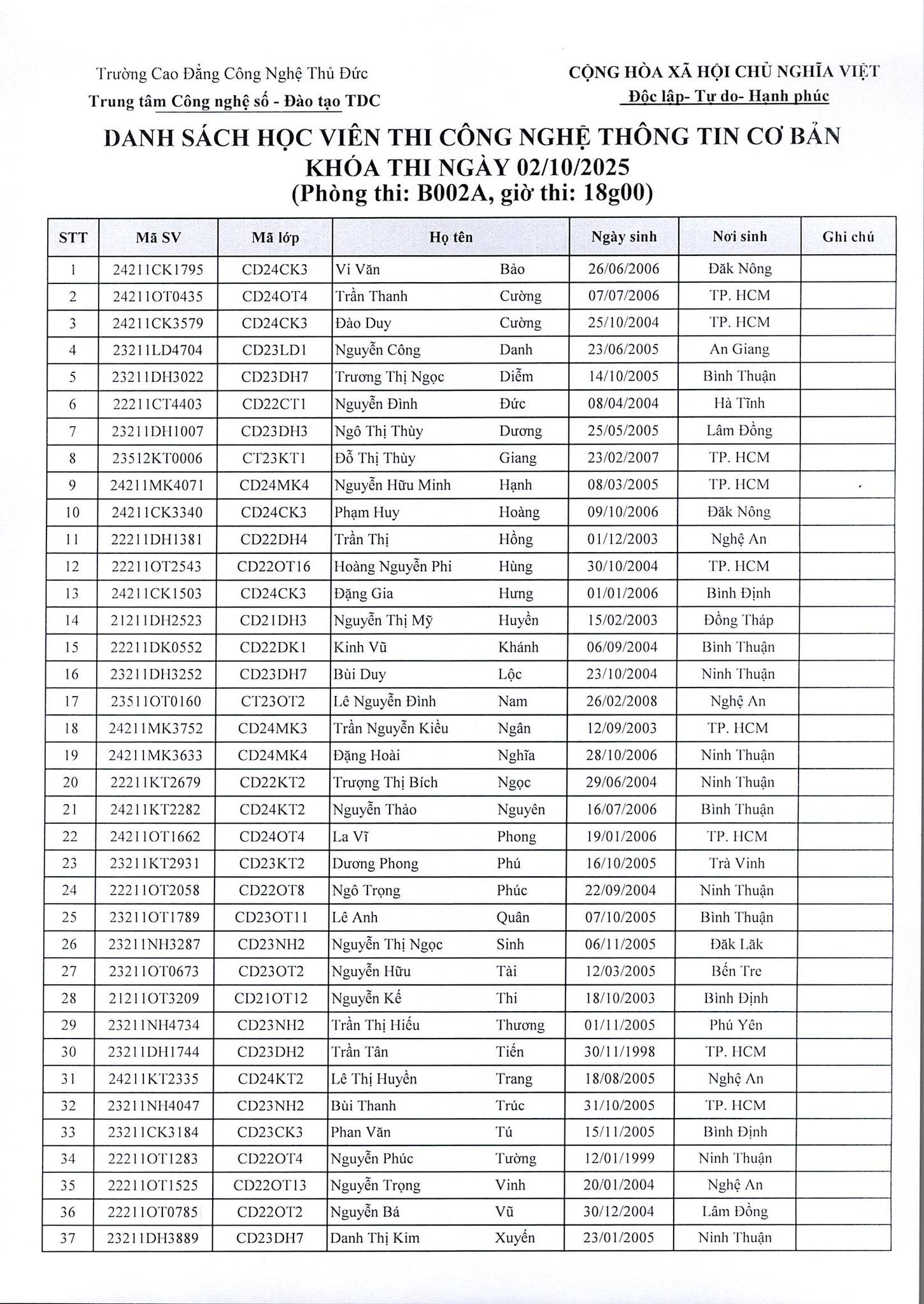 Trung tâm Ngoại ngữ - Tin học - Đào tạo ngắn hạn trường Cao đẳng Công nghệ Thủ Đức thông báo danh sách học viên tham gia kỳ thi ứng dụng Công nghệ Thông tin ngày 02/10/2025.